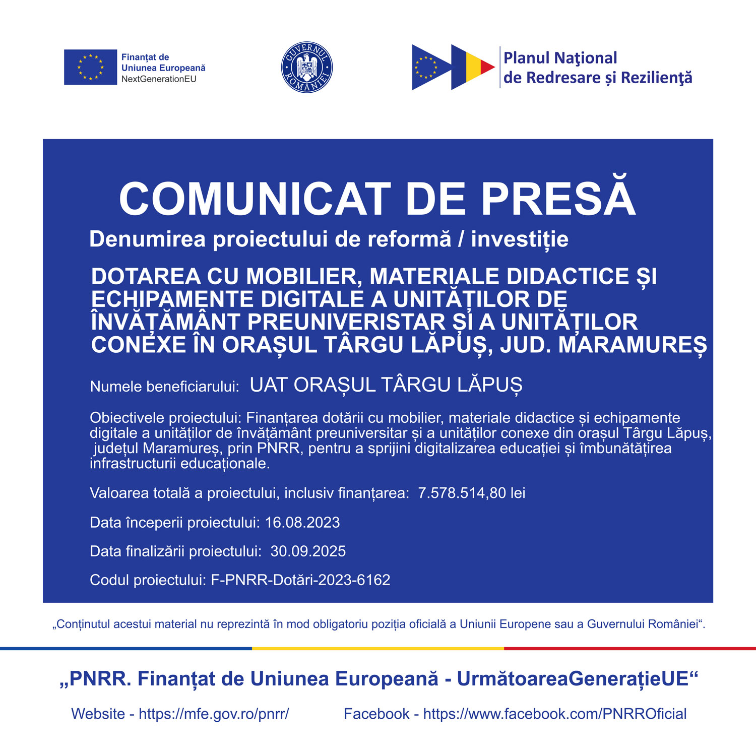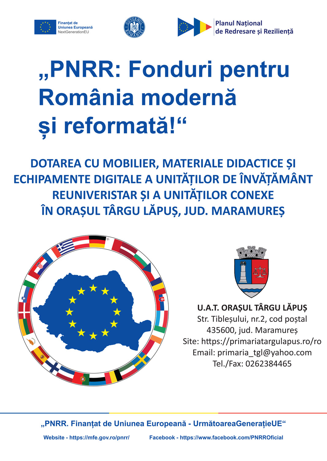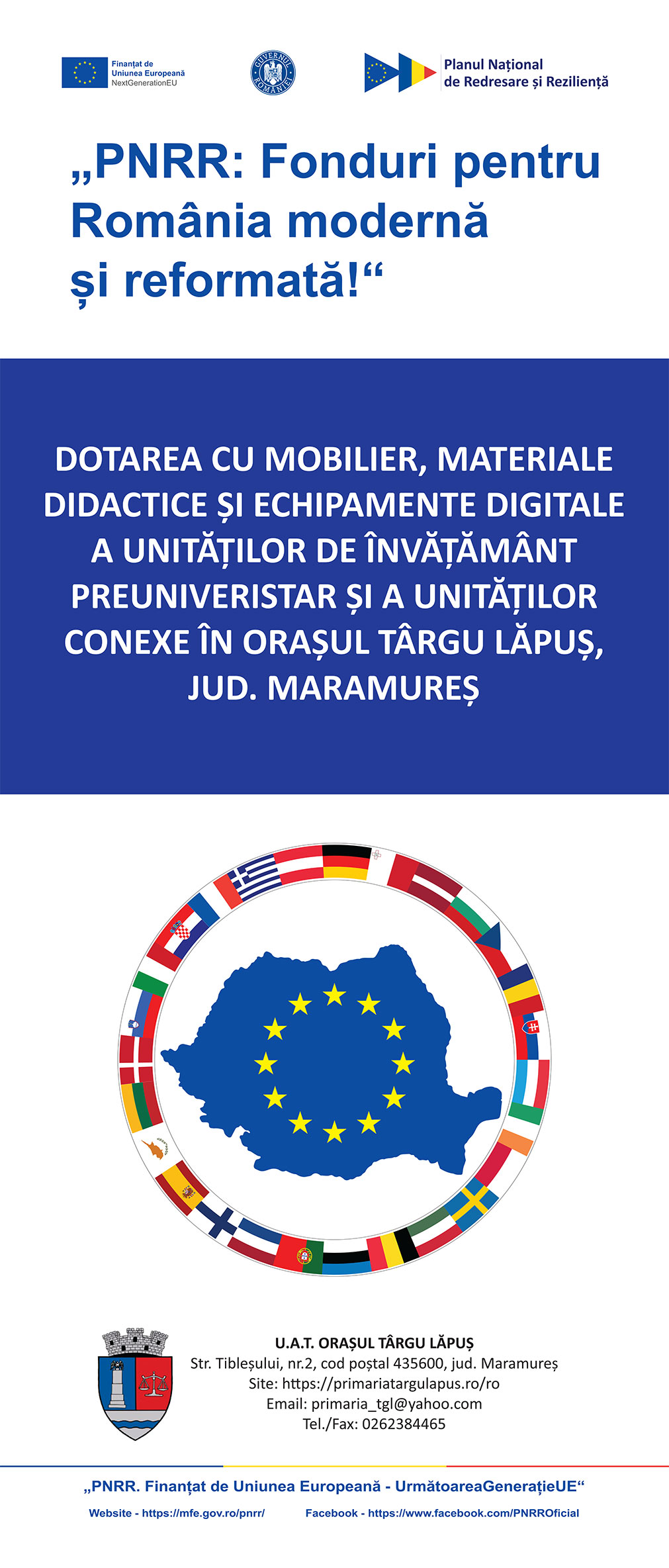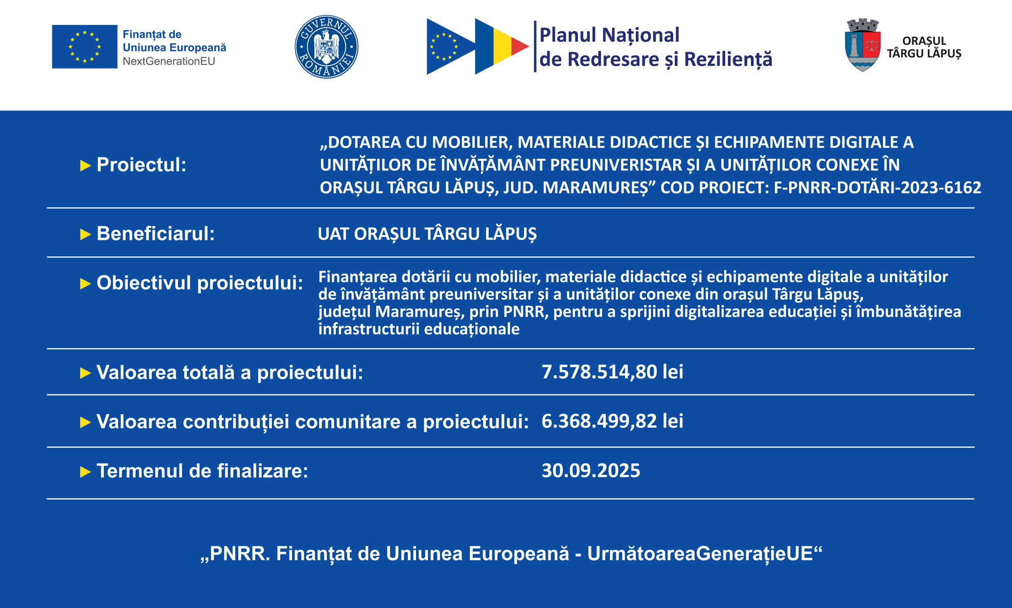 Proiectul ”Dotarea cu mobilier, materiale didactice și echipamente digitale a unităților de învățământ preuniversitar și conexe din Târgu Lăpuș” a fost finanțat de Unitatea Executivă pentru Finanțarea Învățământului Superior, a Cercetării, Dezvoltării și Inovării, în cadrul apelului ”Dotarea cu mobilier, materiale didactice și echipamente digitale a unităților de învățământ preuniversitar și a unităților conexe”, prin PNRR\ Pilonul VI. Politici pentru noua generație\ Componenta C15: Educație \Reforma 4. Crearea unei rute profesionale complete pentru învățământul tehnic superior \Investiția 13. Echiparea laboratoarelor informatice din școlile de educație și formare profesională (EFP) și \Investiția 14. Echiparea atelierelor de practică din unitățile de învățământ profesional și tehnic și Reforma 5. Adoptarea cadrului legislativ pentru digitalizarea educației\ Investiția 9. Asigurarea echipamentelor și a resurselor tehnologice digitale pentru unitățile de învățământ precum și Reforma 6. Actualizarea cadrului legislativ pentru a asigura standarde ecologice de proiectare, construcție și dotare în sistemul de învățământ preuniversitar\ Investiția 11. Asigurarea dotărilor pentru sălile de clasă preuniversitare și laboratoarele/atelierele școlare.